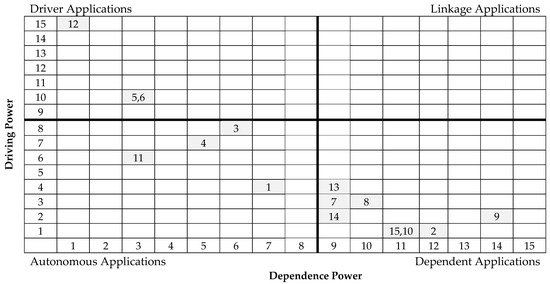 The purpose of the MICMAC analysis (in French: Matrice d’Impacts croises-multiplication appliqúe an classment; meaning cross-impact matrix multiplication applied to classification) is to analyze the drive power and dependence power of constructs or factors (and in this research enabling applications). Commonly accompanying the ISM methodology as its last step, the MICMAC principle is based on the multiplication properties of matrices used to identify the key factors that drive the system in various categories [56,62]. While ISM focuses on organizing various factors/applications into a single and relatively pyramidal hierarchy, the results are expanded back into the two-dimensional matrix of the driving-dependent and linking-autonomous dichotomies through MICMAC analysis. Based on their drive power and dependence power, the factors were classified into four categories (i.e., autonomous, linkage, dependent, and independent factors).