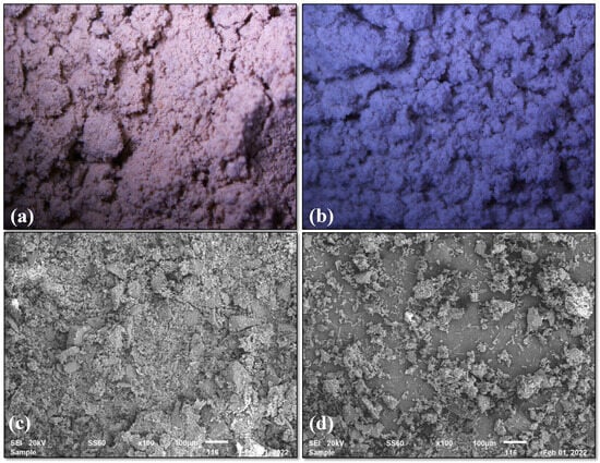 Microscope and SEM images of clay (a,c) and DOL (b,d) with magnification of 100×.