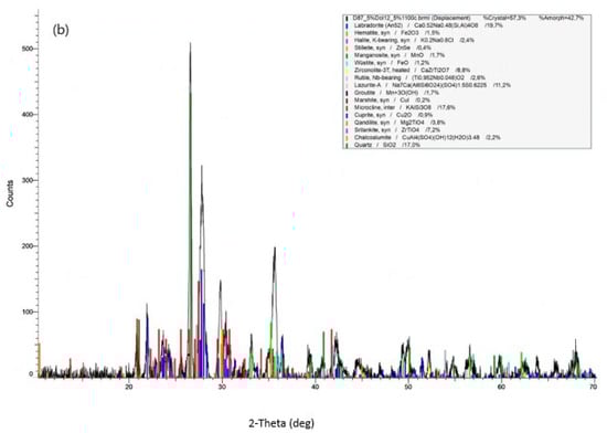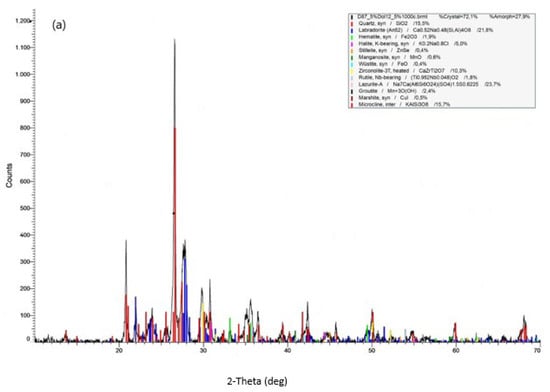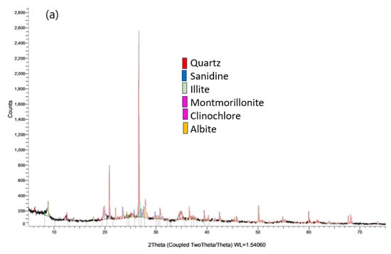 Figure 3 shows the clay and DOL particle size distribution curves. Clay fraction (<2 µm) constitutes 57.6% of the total volume of the raw clay, while silt fraction (>2 µm and <50 µm) is 30.03%. Sand ratios within the clay raw material for different subdivisions, namely very fine, fine, medium, coarse, and very coarse sand, are also given with the total sand of 12.37% (Figure 3a). On the other hand, the majority volume of DOL, 82.5%, consists of silt, whereas clay fraction has 17.5%. A good measure of plasticity and workability is the percentage of clay particles, which is 57.6% for clay and 17.5% for DOL, respectively [25].