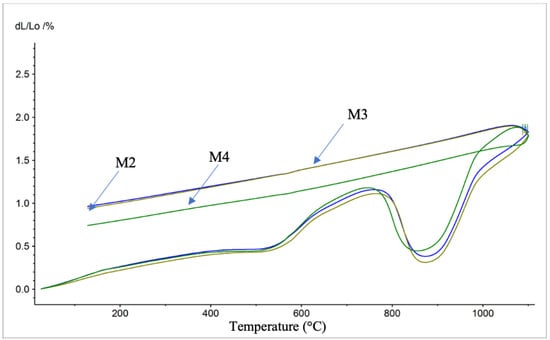 Using a raw material sample that has undergone a heat treatment and a cooling phase, the dilatometry test allows for the measurement of dimensional differences [29]. Additionally, the firing temperature is specified via this test [30]. The test’s maximum working temperature of 1200 °C demonstrated that shrinkage effects are being produced in the material at this temperature because of high-temperature reactions (creation of a glassy phase and/or recrystallizations). As seen in Figure 6, stable and gentle expansions were seen in all mixture types up until the quartz polymorphic inversion α → β at 573 °C [4]. Between 20 and 90 °C, they showed a modest contraction of 0.22%, followed by the elimination of water absorbed (0.88%) below 256 °C. The structural change and likely breakdown of carbonates causes a maximum expansion of 1.7% at 850 °C. As a result of firing, more heating has caused progressive contraction. This marks the start of the melting phase.