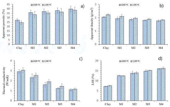 Results of apparent porosity (a), apparent density (b), thermal conductivity (c), and LOI (d) for clay and other mixtures (M1, M2, M3, M4).