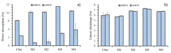 Results of linear shrinkage (a) and water absorption (b) for clay and other mixtures (M1, M2, M3, M4).