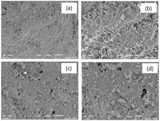 SEM images of fresh-cut surfaces of M2 brick specimen fired at 1000 °C (a,b) and 1100 °C (c,d): (a) magnification ×300; (b) magnification ×600; (c) magnification ×300; (d) magnification ×600.