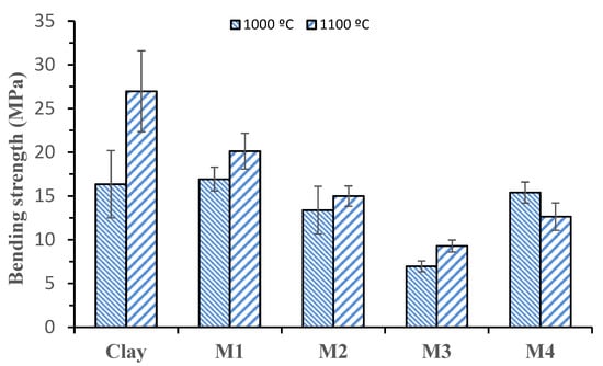 The bending strength values for brick specimens incorporating DOL are shown in Figure 11. The values varied between 6.96 mPa and 26.97 mPa. The highest bending strength was obtained in the control sample clay brick fired at 1100 °C. There was no significant change in bending strength value when the 10% of DOL was added, but with the increment of DOL amount, the bending strength declined. The main reason of this downturn can be due to the fact that the amounts of SiO2 as clay and DOL were 57.61% and 1.59%, respectively. Unlike the DOL effect, the firing temperature had a positive change on the bending strengths of the samples. In the control sample, an increase of 65% was observed, while in other samples containing DOL the change was between 12% and 33% with the elevation of temperature from 1000 °C to 1100 °C. An abnormality was recorded in the M4 mixture as result of the sample moving against the trend in both DOL and temperature effects. The downturn trend with DOL addition was interrupted when bending strength increased by more than 120% from M3 to M4. Similarly, while temperature increase positively affected the bending values of the samples in all mixtures, it had an adverse effect in the M4 specimen, with a 17% decrease in strength. The firing temperature of 1100 °C seems to have a positive impact on the bending strength of the control sample clay brick. This result may be attributed to the specific phase changes identified in the XRD analysis, such as the increase in quartz and microcline peaks, which could contribute to the reinforcement of the brick’s structure. Another factor affecting bending strength is porosity as voids play a significant role in fired clay brick bending strength [49]. The lesser the number of voids, the higher the bending strength in bricks. An increment of DOL in samples increased the porosity and decreased the bending strength from M1 to M4. This relationship of porosity and bending strength is consistent with previous studies [31,50]. Despite the fact that using DOL as a substitute material decreases the bending strength, the values are in a good range and DOL can be used for economical and sustainable construction.