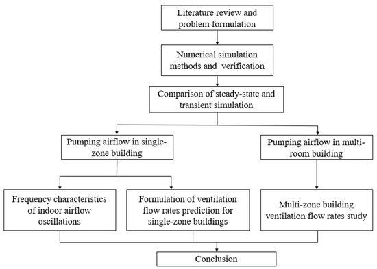 There are different conclusions about the relationship. In addition, previous research did not consider a multi-room building, which is the more realistic case. Does pumping ventilation still exist, and what is the difference for rooms in different locations? Aiming to answer these questions and further understand pumping ventilation, this paper analyzed the qualitative and quantitative characteristics of the pumping airflow of a single-room building, and it also investigated the pumping airflow of a multi-room building. Figure 1 shows the flow chart of this paper.