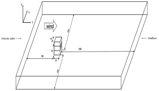 The computational domain has a significant impact on the simulation results, and the blocking ratio is thought to be important [16], which meant that it should be less than 3% of the computational domain size. Additionally, for the building body, the computational domain’s sides, the top, and the external exit boundary all need to be at least 5 H and 10 H away from the building, respectively. The computational domain is 186 m × 96 m × 9 m in size because only the quasi-3D building case was taken into account in this study, which meant that the height of the computational domain was equal to the height of the building, the side distance is 5 H, and the distance from the leeward side to the exit is 15 H. The blockage ratios of it are less than 3%. Due to the fact that the pumping flow involved two apertures and that the spacing between the two openings has an impact on the airflow, three cases with varying spacing are adopted in this paper (e.g., Figure 3). The quoted dimensionless aperture distance is
