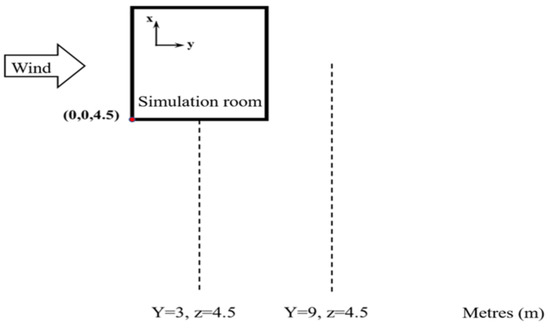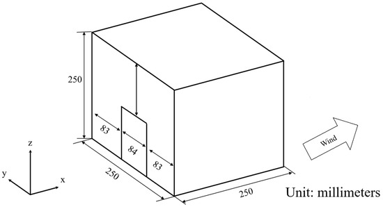 A three-story building was taken as the model 1 (e.g., Figure 2). The total height of the building H is 9 m, and there is one room on each floor. The dimension of each room is 6 m × 6 m × 3 m (B × B × 1/3 H). The natural ventilation room is located on the second floor with two leeward openings of the same size: 1 m × 1 m. The centers of the two openings are 3 m apart and 1.5 m from the respective closer sides of the building. The three rooms in the building are not connected to each other and are separated by floors or ceilings.