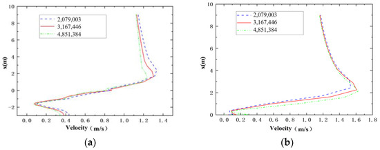 The domain was constructed using the hexahedral gird (Figure 4). The grid was refined in the opening and the near-wall. For the case of s′ = 0.5, three grid schemes with the grid numbers of 2,079,003, 3,167,446, and 4,851,384 were selected for independence verification. The corresponding y+ values for the three-grid method were 45, 30 and 15, and the minimum distances of the grids from the wall were 0.015 m, 0.01 m, and 0.005 m, respectively. The monitoring line Y = 3 m, and Y = 9 m in the plane with a Z value of 4.5 m is chosen for the sample set (Figure 5). The results with different numbers of grids are shown in Figure 6. As can be seen, the changing rules of the wind speed outside the building showed the same trend. Based on the results, the grid number of 3,167,446 (Figure 4) is finally selected for the case, as a further increase in the mesh density does not produce obvious changes in the numerical solutions.