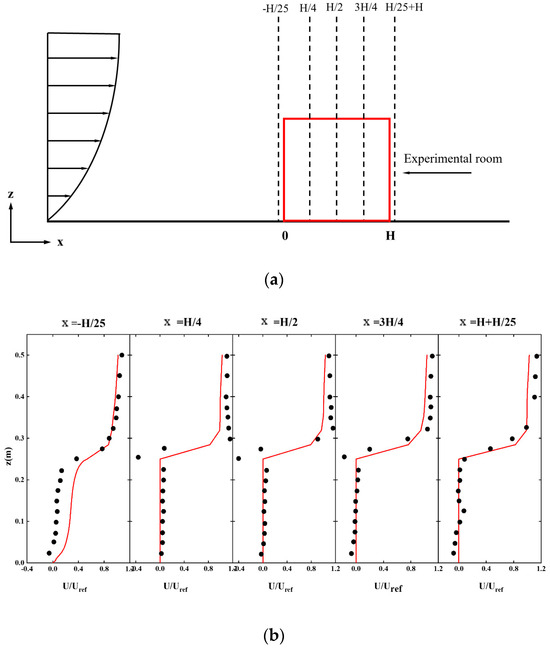 Validation of CFD methodology. (a) Schematic diagram of the location of wind tunnel experimental data measurements. (b) Numerical simulation of the velocity profile along the measurement line (red line) compared to the experimental values (black solid dots).