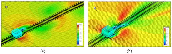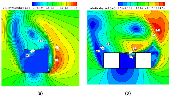 Velocity distribution of outdoor flow field in different buildings. (a) Single-room buildings (model 1). (b) Multi-room buildings (model 2).