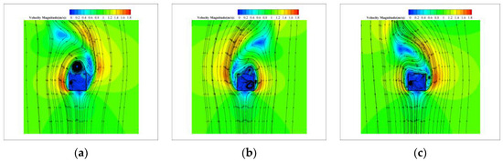 The airflow at the back of the building was forced to enter the building through the opening on the right side, create a circulating airflow that followed the vortex’s direction, and exit through the opening on the left. The airflow on the opposite side, however, was exactly the opposite. It formed an anti-clockwise vortex on the right side surface. This caused the airflow to enter the room through the left side opening after separating and attaching itself to the leeward surface at the rear corner point of the lower right side. It then formed a circulating airflow that flowed out of the right side opening in the same direction as the vortex in an anti-clockwise direction.