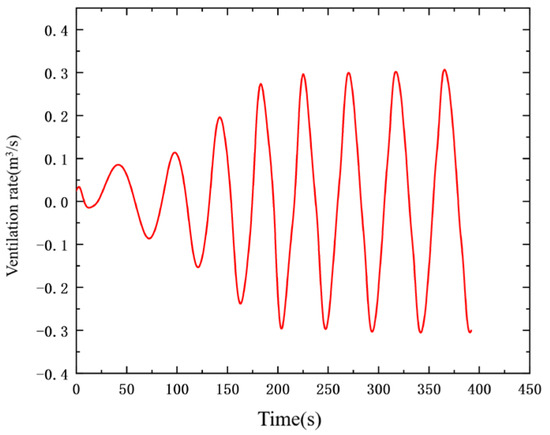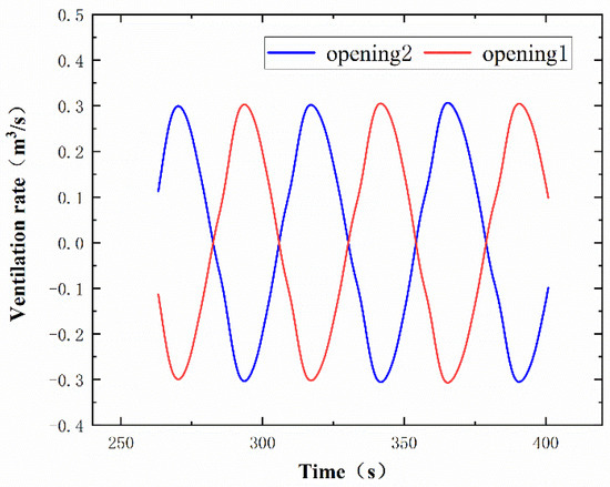 Vortices were produced and shed alternatively on the either side of the square building, finally forming a regular vortex street in the wake flow. As a result, the fluctuating ventilation named as the pumping airflow was generated. Figure 12 describes the ventilation flow rates of the building changing with time. During the first 200 s, the changing amplitude of the ventilation flow rates was increasing gradually because the vortex shedding of the airflow was still in the developmental stage. After that, the change in amplitude decreased to form the regular fluctuations similar to the sinusoidal form. From Figure 13, it can be discovered that not all of the ventilation flow rates change with the sine wave, especially when the opening spacing was adjusted. However, all the cases clearly displayed the features of a regular fluctuation.
