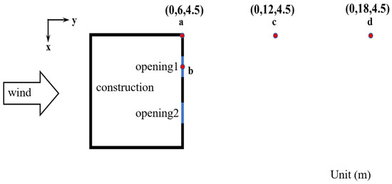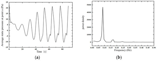 Four monitoring points were selected in order to analyze the vortex-shedding frequency, as shown in Figure 14. Point b was located at the center of the opening 1 with a height of 4.5 m. The time-domain and the frequency spectrum plots of the static pressure at point a with the incoming wind speed as 4 m/s are presented in Figure 15a,b, respectively. As shown in the time-domain plot, the static pressure changed periodically. From the frequency spectrum plot, it was possible to determine that the shedding frequency was 0.0825 Hz, at which the power spectral density achieves its maximum value.