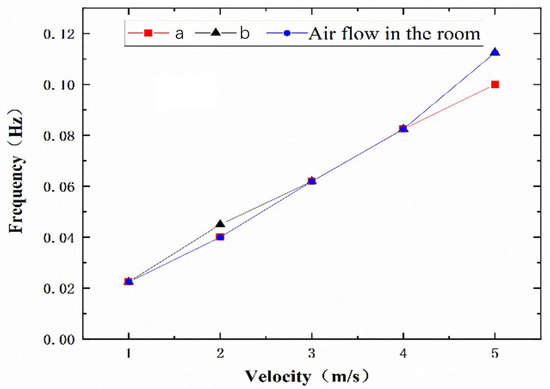 Figure 18 depicts the oscillation frequency of the airflow with various wind speeds, showing there was a significant association between the oscillation frequency of the airflow and the wind speed. As the wind speed increased, the frequency of the oscillations inside the building rose. The airflow oscillation frequency was basically the same as the vortex-shedding frequency around the building; all of them varied monotonically with the wind speed, as shown in Table 3 and Figure 18. Moreover, if the dimensionless opening distances s′ changed from 0.25 to 0.5, the simulation results showed that the frequency was only different by about 5%. It could be concluded that the opening distance had almost no impact on the oscillation frequency of the indoor airflow.