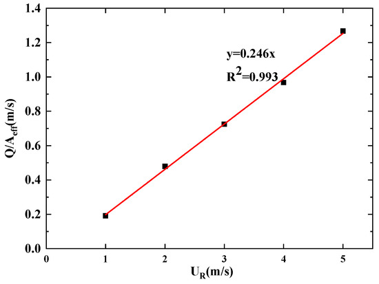 The plot of the relationship after the data fitting and the Pearson’s correlation coefficient are shown in Figure 19, and its Pearson’s correlation coefficient (R2) is 0.993. It indicates that there is a strong linear correlation between the ventilation flow rates and the wind speeds.