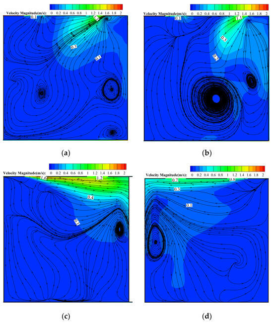 Velocity and streamline distribution of indoor flow field in different rooms in model 2. (a) Room 1. (b) Room 2. (c) Room 3. (d) Room 4.
