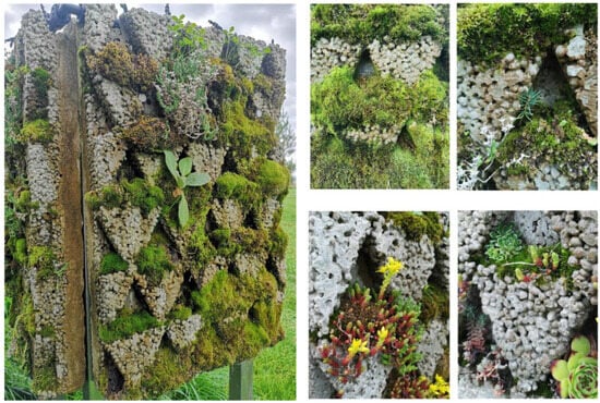 Pervious concrete, featuring high porosity and excellent water permeability, was selected as a material for plant growth by Riley et al. [9] and Hemalatha et al. [12]. The voids in pervious concrete may be filled with soil, accommodating the development of root systems and providing nutrients for plant growth. It has been demonstrated that pervious-concrete-based living walls may principally host the growth of different plant species; however, the long-term survival of plants has not been evidenced. The system presented by Riley et al. [9] suffered from substrate erosion, as the external pervious concrete layer was too flat. As a result, only grasses, sedums, and mosses survived after the first winter (the panels were installed in a humid subtropical climate, in Lyon, France). Similarly, only short-term growth results were reported by Hemalatha et al. [12], where stem-cut or seeded plants (Portulaca gradiflora; Trigonella foenum-graecum) were manually inserted into the soil-filled pervious concrete panel. In the latter study, the growth of plants was examined only in a greenhouse conditions.