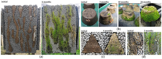 The manual installation of plants on these walls is extremely labor-intensive and impractical for large-scale applications. To simplify the production technology and ensure the natural bio-colonization of the wall panels, a specific degradable material, hereinafter referred to as bio-booster, was developed and used for the production of 12 additional LLC panels (field test Series 2). The main purpose of the bio-booster was to accelerate the natural wall colonization process in the selected panel regions, thus, controlling the aesthetic appearance. After several trials, forest topsoil and recycled paper pulp (in a 1:1 mass ratio) were selected as the main constituents of the bio-booster. Forest topsoil naturally contains bacteria, spores, and seeds from indigenous plants (mosses, fungi, and grasses) that germinate in the appropriate environmental conditions. The cellulose fibres from the recycled paper pulp provide strength and stiffness to the topsoil, facilitating the manufacturing process and allowing the formation of complex geometrical shapes (Figure 2a). Under suitable environmental conditions (the bio-booster was kept constantly wet, with an average daily temperature ≥ 5 °C), the initial germination of mosses was observed after 2–3 months, both in the laboratory and during field exposure (Figure 2b,c). Moss cushions developed on the bio-booster 12–24 months after test initiation (Figure 2b).