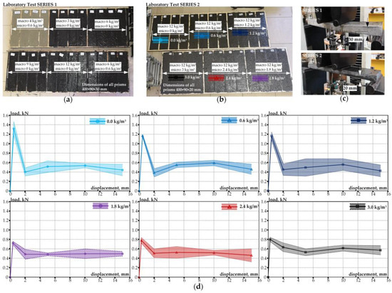 Two experimental attempts to optimize the mechanical and physical properties of HPC were carried out. At the first stage (laboratory test Series 1), several previously developed high- and normal-strength concrete compositions with different amount of synthetic fibre were examined. In total, 24 prisms (30 × 90 × 400 mm) were produced and tested under a four-point loading scheme (Figure 3a–c).