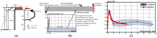 Numerical analysis was carried out using the Atena (version 5.9.0.20863) non-linear finite element software [26]. A simple bilinear material model was adopted for tensile concrete, composed of the initial elastic component and constant residual stress, fR. The latter was calculated from the equilibrium conditions of internal forces and bending moments, as schematically shown in Figure 4a. To simplify the solution procedure, the constant distribution of residual stresses was assumed within the tensile zone. Such a simplification may be reasonable for fibre-reinforced concrete, as was demonstrated by Gribniak and Sokolov [27]. The assumed tensile law function for concrete is shown in Figure 4b, along with the other material properties used for the numerical analysis. As may be seen from Figure 4c, the simplified concrete tensile law function results in a reasonably good approximation of the experimentally observed results: the simulated maximal load has an error of 3%, whereas residual strength is mostly within the 95% confidence interval. Thus, this bilinear material model was used in the further numerical simulations.