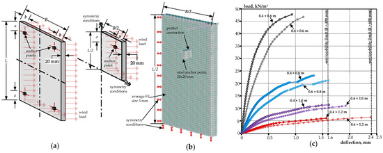The results of the numerical simulations are summarized in Figure 5c and Table 1. The maximal negative wind pressure and anchor pull-out force were calculated for all cases. The limiting factors in the analysis were either the fracture of the concrete at the anchor point or the serviceability limit state of the panel. Following the recommendations of Sousa [28], a maximal deflection limit of L/250 was adopted (where L is the shortest side dimension).
