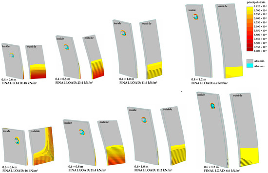 A graphical representation of the principal strain distribution at the final loading step is shown in Figure 6. The grey shaded areas show the strain in the concrete below the theoretical cracking strain of 142 µε. Fracture strain limit (ε > 142 µε) was reached in all analyzed cases, resulting in the opening of microcracks in the central parts of the panels. Obviously, larger fractured regions were obtained in smaller panels, which were simulated up to higher loads. The fracture regions in large panels (0.4 × 1.2 m and 0.6 × 1.2 m) were limited due to the lower load intensity, which, in turn, was governed by the serviceability criteria. Such limited fracture strain areas without crack localization may be acceptable due to the non-brittle deformation of fibre-reinforced HPC.