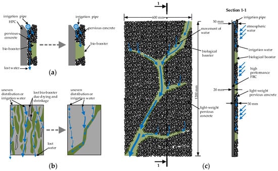 Figure 7. Recommendations for the new design: (a) placement of the bio-booster, avoiding water loss through pervious concrete; (b) suggested distribution of bio-booster for the more effective use of irrigation and atmospheric water; and (c) a new design proposal for an LLC panel. - The greening speed of LLC panels is strongly dependent on the moisture distribution and the shape of the bio-booster. The LLC panels in test Series 2 consisted of separated bio-booster inserts of different sizes (Figure 2a), and some of the small elements were lost due to drying and shrinkage. This, in turn, was caused by the uneven distribution of irrigation water. To overcome the problem of uneven water distribution, a continuous bio-booster layer should be produced (Figure 7b);