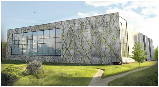 Based on these considerations, a new LLC panel design is suggested (Figure 7c). The thickness of the HPC layer is set to 20 mm, whereas the side dimensions of the panel are increased up to 0.6 × 1.2 m. To optimize the use of irrigation water, the LLC panel has a diagonal, river-shaped bio-booster distribution. The continuous bio-booster layer is designed to have direct contact with the HPC layer, contributing to the more efficient use of irrigation water. To improve water retention capacity, the thickness of the bio-booster is increased to 30 mm. It is estimated that the panels of a new design will allow for a significant (30–50%) savings in a use of irrigation water, and, more importantly, steady growth of plants irrespective of the amount of natural precipitation. In fact, LLC panels of field test Series 2 suffered from excessive drying and loss of bio-booster material, especially at the side edges (Figure 2a). The panels of a new design have a diagonally shaped bio-booster that effectively collects both irrigation and atmospheric water, increasing moisture retention capacity and, consequently, the greening performance of the LLC panel. As was observed in the pilot field tests, initial greening areas on the new panels are expected in 3-6 months after panel installation. Several additional years will be required for mosses to grow into a well-developed cushions. Such natural colonization is much slower in comparison to other living walls solutions. For example, pre-vegetated modular panel systems may green the building’s façade almost simultaneously with the installation process [31]. Similarly, hydroponic felt-based systems also allow for a quick growth of the selected and the specifically positioned pre-vegetated plant species [32]. Although the existing modular or felt-based living wall systems allows for a quick greening of a biologically diverse vertical surfaces, the longevity, high installation and the annual maintenance costs are the main concerns of expert consultants and green wall installation managers [33]. In this respect, the LLC panels of a new design have an advantage of an almost maintenance-free system, which evolves and changes naturally. In addition, non-regular diagonal greening allows for an aesthetically attractive building façade texture. Figure 8 shows an example of an idealized façade with LLC panels of the new design.