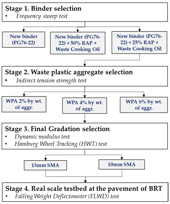 Researchers and practitioners have recognized the need to address these challenges and have explored numerous strategies to mitigate pavement damage [17,18]. Recent studies in asphalt pavement have explored innovative approaches to enhance performance and sustainability. Hoy et al. [19] evaluated asphalt pavement maintenance using recycled materials, emphasizing the benefits of integrating recycled asphalt pavement (RAP) with asphalt binders. Zhang et al. [20] provided a comprehensive review of phase change materials for temperature regulation in asphalt pavements. Sang et al. [21] conducted a factor analysis to assess asphalt pavement performance, specifically structural strength and hidden cracks. Suebsuk et al. [22] examined variations in cement-stabilized reclaimed asphalt pavement in tropical climates. Xue et al. [23] focused on pavement performance based on the separation technology of asphalt and aggregate in RAP. Sohail Jameel et al. [24] assessed asphalt mixtures modified with renewable oils and RAP for improved sustainability. Zhao et al. [25] investigated the impact of crumb rubber and reclaimed asphalt pavement on the viscoelastic properties of asphalt mixtures. Additionally, recent research [26,27,28,29,30] has conducted various studies on green pavements, rejuvenating agents, and rubberized asphalt mixtures. These studies collectively contribute significantly to advancing research into asphalt pavement, addressing aspects of performance, sustainability, and material innovation. Despite these efforts, there remains a demand for more comprehensive research to develop sustainable, resilient, and cost-effective solutions that ensure the durability of BRT bus stop pavements in diverse urban contexts [31]. This paper aims to contribute to the ongoing dialogue by investigating a novel approach that combines modified binders, recycled materials, and optimized mix designs to enhance pavement longevity and performance in BRT systems, with a particular focus on the bustling streets of Seoul, South Korea.