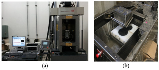The Hamburg Wheel Tracking test (HWT) was employed to quantify the extent of plastic deformation exhibited by the bus stop mixtures based on AASHTO 324 [53]. This test method primarily evaluates the susceptibility to settlement by immersing a compacted specimen in hot water at a temperature of 50 °C, followed by the repeated application of a wheel load, with each load totaling 7054.5 N. For testing purposes, a cylindrical specimen measuring 150 mm in diameter and 60 mm in height was prepared by slicing one side of a cylindrical sample [53]. In accordance with the guidelines set by the United States Department of Transportation, the settlement amount, measured after subjecting the specimen to 20,000 loading cycles, should not exceed 20 mm to ensure the optimal performance and durability of the Hot Mix Asphalt (HMA) mixture. The general view of the dynamic modulus test is presented in Figure 3b. This test played a crucial role in evaluating the rutting resistance and overall performance of the bus stop mixtures, providing vital data for the development of sustainable and robust pavement solutions in the context of BRT systems in Seoul.