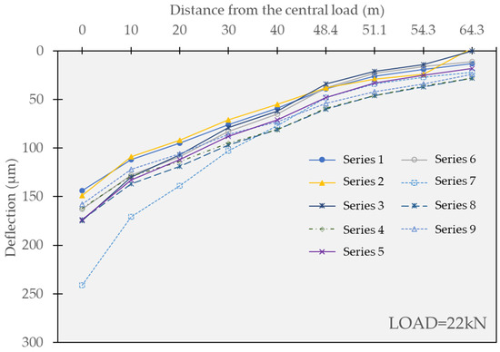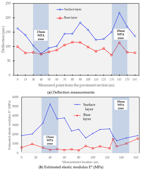 The results of the falling weight deflectometer (FWD) test conducted at the actual BRT section in Seoul provide a practical assessment of the pavements’ performance. As depicted in Figure 10, the deflection bowl measurements, which quantify the extent of surface deflection under a dynamic load, were taken at various locations along the BRT section. The results indicate that the pavement reinforced with SMA mixtures incorporating 13 mm NMAS and 4% WPA displayed robust and resilient behavior. The deflection values recorded at different measuring points exhibited minimal deflection, signifying a high resistance to deformation and pavement distress. This finding underscores the effectiveness of the 13 mm NMAS and 4% WPA combination in enhancing the structural integrity and durability of the BRT pavement. In contrast, the 10 mm NMAS and 4% WPA mixture, while still offering satisfactory performance, demonstrated slightly greater deflection, implying a relatively lower capacity to withstand dynamic loads.