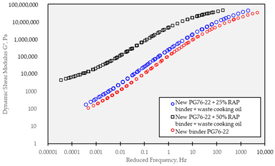These findings are aligned with related research due to the underlying mechanism of the modified binder’s performance [55,56]. The integration of 25% extracted RAP and 3% waste cooking oil has contributed to the balanced G* modulus of the binder. The reclaimed asphalt and cooking oil have likely acted as modifiers, enhancing the flow and deformation characteristics of the binder.