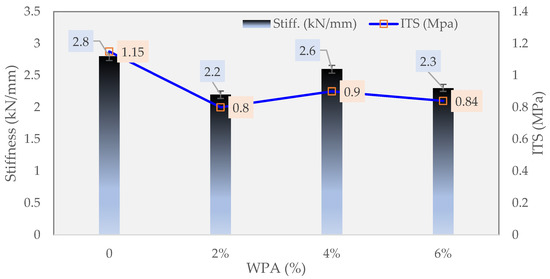 The Indirect Tension Strength (ITS) test results demonstrate the significant influence of WPA content on the mechanical properties of SMA mixtures. The ITS result is shown in Figure 7. As the WPA content increases from 0% to 6%, the ITS values exhibit a notable trend. Without WPA (0%), the ITS value is the highest of the tested materials at 1.15 MPa. However, the introduction of 2% WPA lowers the ITS value to 0.8 MPa, indicating a slight decrease in tensile strength. Interestingly, at 4% WPA content, the ITS value increases to 0.9 MPa, suggesting a positive impact on the mixture’s tensile strength. Subsequently, at 6% WPA content, the ITS value slightly decreases to 0.84 MPa. The stiffness of the SMA mixtures, measured in terms of stiffness modulus (kN/mm), follows a similar trend. Mixtures with 0% and 4% WPA exhibit the highest stiffness values, with 2.8 kN/mm and 2.6 kN/mm, respectively. The 2% WPA mixture displays a lower stiffness of 2.2 kN/mm, and the 6% WPA mixture registers a stiffness of 2.3 kN/mm.