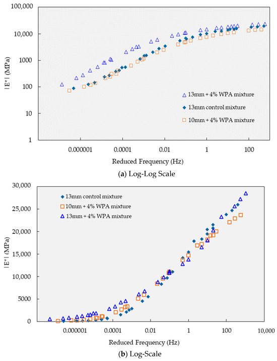 The dynamic modulus test results reveal valuable insights into the mechanical properties and performance of SMA mixtures with varying NMAS and under different loading conditions, shedding light on their suitability for sustainable pavement solutions within BRT systems in Seoul. As displayed in Figure 8, the dynamic modulus (|E*|) values are consistently higher for the 13 mm NMAS mixtures compared to the 10 mm NMAS mixtures under both normal and double-load conditions. The 13 mm NMAS mixtures exhibit a superior ability to withstand the dynamic forces associated with BRT traffic, reflecting their enhanced structural integrity and resistance to deformation. Moreover, the results further emphasize the positive influence of the 13 mm NMAS on the mixtures’ performance, positioning them as the preferred choice for BRT pavement applications in Seoul. This comparative analysis contributes significantly to our understanding of the optimal NMAS and its role in achieving the desired pavement characteristics for sustainable BRT systems.