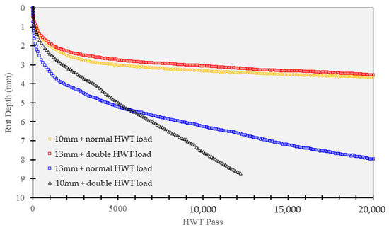 The Hamburg Wheel Tracking (HWT) test results provide critical insights into the rutting resistance and overall performance of the SMA mixtures containing various NMAS. As shown in Figure 9, two NMAS options were explored, namely 10 mm and 13 mm, both incorporating 4% WPA, 25% RAP, and the optimized binder. In this test, the mixtures were subjected to repeated wheel loading under hot water immersion, simulating the harsh conditions experienced in real-world pavement applications.