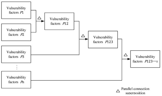 (4) Based on the calculated vulnerability probability distribution value of each element, the vulnerability distribution of all elements under each upper-level element is gradually computed after parallel connection [50]. The vulnerability probability at all levels is then calculated by combining the weight information of upper-level elements: