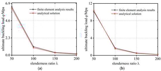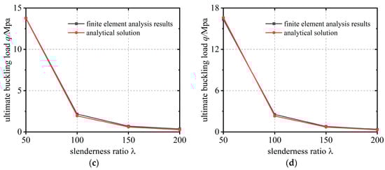 Figure 4 illustrates the theoretical and numerical solutions for the bearing capacity of hingeless circular arches under different rise-span ratios and slenderness ratios. These curves represent the theoretical values and finite element numerical solutions of the ultimate buckling load.