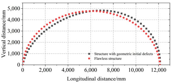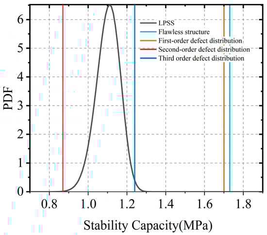 From Figure 6 and Table 3, it is evident that the probability density reconstructed using the Latin hypercube sampling method based on the fractional moment matrix predominantly falls between the stable bearing capacity of structures with random second-order distribution defects and those exhibiting perfect structures. Furthermore, the reliability index calculated from the probability distribution obtained via the LPSS method, corresponding to β = 3.7, closely corresponds to the bearing capacity associated with the second-order antisymmetric geometric initial defects of the random distribution. This substantiates that the imposition of random second-order distribution defects can, with the use of fewer computational resources, reconstruct the most adverse defect distribution for structures in most cases, thereby providing a certain guaranteed bearing capacity.