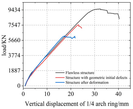 It is evident from the graph that a reduction in mesh size leads to a decrease in the arch’s load-bearing capacity. This decline can be attributed to the premature attainment of the predetermined stress state by the edge elements due to the decreased mesh size, resulting in their removal and subsequently compromising the overall load-bearing capacity of the arch.