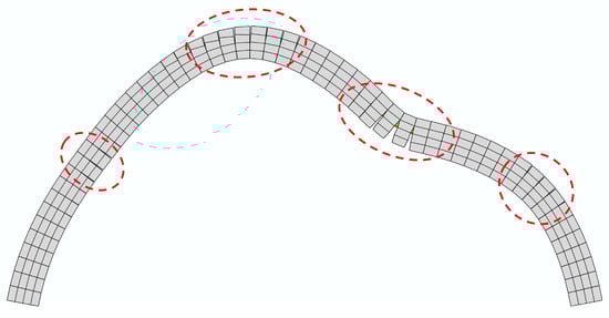 To address this limitation, Zhao [14] developed a two-phase numerical model for stone arch bridges that incorporates cohesive elements. Experimental verification has demonstrated the effectiveness of this two-phase numerical model in simulating the mesoscale failure process of the structure. The mesoscale simulation also has certain limitations, such as the inability to capture crack propagation. It captures defects under extreme conditions. This paper adopts the mesoscale modeling approach due to its ability to integrate macroscopic and microscopic features and provide higher efficiency required for engineering problems. Additionally, due to construction-related factors, geometric initial defects are inevitably present in stone masonry arch bridges [15,16,17,18,19,20].