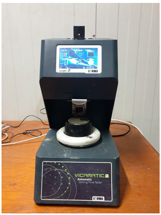 The setting time of cement paste was measured by the Vicat needle test method in accordance with ASTM C 191 [27], where CONTROLS’s (Milan, Italy) Vicamatic2 automatic measurement system was used (Figure 1). To measure the initial and final setting times for each cement mix, the penetration depth was measured every 30 min after the start of the test. Because the penetration depth rapidly decreases closer to the initial setting time, the penetrating needle was set to drop automatically every five minutes when the penetration depth became less than 30 mm. The initial reading of penetration depth was 38 mm. Due to the nature of the equipment and difficulties in obtaining measurements up to 0 mm, the final setting time was determined as the time when the penetration depth became less than 3 mm. Measurements were performed after stabilizing the cement paste for 24 h in a constant temperature and humidity chamber at curing temperatures of 10, 20, and 45 °C and humidity of 85%.