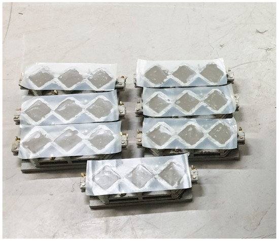 The compressive strength of cement paste was measured to calculate the activation energy and verify the mechanical properties related to the addition of nano- and micro-sized pozzolanic materials. Cubic specimens of 50 mm were prepared to measure the compressive strength of the cementitious composites (Figure 2). The test specimens were subjected to water curing temperatures of 10, 20, and 45 °C and humidity of 85% in accordance with the procedure, and the compressive strength was measured at 2, 4, 8, 16, 32, and 64 times the final setting time determined through tests described in Section 3.2. The compressive strength was measured using a 300 kN universal testing machine (AG-300KMX of SHIMADZU, Kyoto, Japan) in accordance with ASTM C 109 [28]. Compressive strength was measured under a loading rate of 0.3 MPa/sec and the average value was presented for 6 specimens in each case.