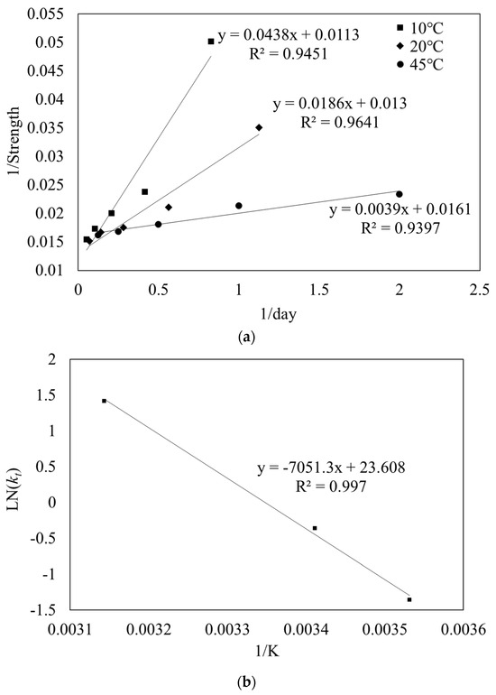 Activation energy determination method of cement paste. (a) Compressive strengths of cement pastes under different curing temperatures. (b) Determination of Ea using ASTM C 1074 [29].