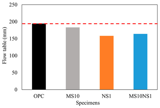 Flowability of the cement pastes containing the silicate-based nano- and micro-sized pozzolanic materials was tested using a flow table (KS L 5111 [26]). In the test, the flow after 25 strikes was measured using a vernier caliper on the flow table. Measurements were performed twice for the same mix and the average value was used.
