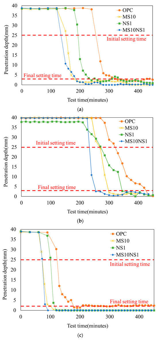 Vicat test result of silicate-based binder composites at curing temperatures. (a) 20 °C. (b) 10 °C. (c) 45 °C.