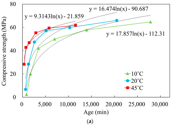 Figure 6 shows the compressive strength measurement results corresponding to the mixes with different pozzolanic binders and curing temperatures. For compressive strength measurement, the average value for six specimens was used. The measurement errors were within 5%. Strength measurements were summarized according to the contents of each mix and multiples of the setting time. The compressive strength improvement rate is expressed in the form of y = A∙ln(x) − B as a logarithmic function of time. Here, A varies depending on the compressive strength improvement rate. In the case of OPC, it attained the highest value of 17.857 at 10 °C curing temperature and followed a decreasing trend as the curing temperature increased; it dropped down to the level of 56.47% for 45 °C curing temperature. This trend is very similar to that evidenced in strength development corresponding to the curing conditions, which is typical in the case of cement paste. In the case of micro-silica, a tendency similar to that of OPC was observed. However, the compressive strength dropped down to the level of 89.51% for 45 °C curing temperature, thus registering a sharp difference in the extent of reduction in relation to the curing temperature. The mix containing nano-silica also exhibited a tendency similar to the aforementioned cases, but the strength improvement rate at lower temperature was high at 20.749. Particularly, in the mix substituted with both nano- and micro-silica together, the strength improvement rate and the initial strength were both high, and the highest value of 20.105 was observed for 20 °C curing temperature. The difference in strength improvement rate depending on the curing temperature was also found to be the smallest, as the level ranged from 91.08 to 93.3%. Based on the aforementioned results, it is evident that the use of pozzolanic materials improved the initial strength due to increased filling rate of the internal pores and the influence of the curing temperature declined because of the densification of the internal structure, which, in turn, reduced the impact of the external temperature. Micro-silica has average particle sizes in the range of 20 to 30 nm. It accelerated setting time in the same manner as the filling effect of nano-silica with a particle size of approximately 14.05 nm. Although the diameter of the average micro-silica particle is approximately twice as much as that of the average nano-silica particle, the volumes may differ by 9.73 times. It is quite evident from the aforementioned results that both micro-silica and nano-silica improved strength by generating hydrates through the pozzolanic reaction.