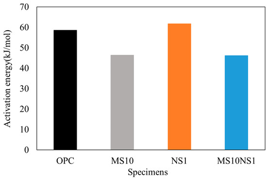 - The highest activation energy was measured in the mix containing nano-silica. The mix containing micro-silica showed low activation energy (approximately 80% compared to OPC). When both nano-silica and micro-silica were added, the decrement increased.