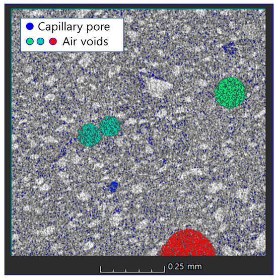 The microstructure of cement affects the durability and strength of concrete. Porosity of cementitious materials can be measured in various ways using the Brunauer–Emmett–Teller (BET) method, mercury intrusion porosimetry (MIP), and X-ray computed tomography (CT). BET, a method proposed by Brunauer, Emmett, and Teller, determines porosity inside the cement hydrate microstructure based on the amount of gas or water vapor adsorbed based on the gas adsorption theory. MIP is used to measure the amount of micropores and pore size distribution in the microstructure inside cement paste as with BET. It measures the internal porosity by injecting mercury. BET may be favorable for measuring micropores in a specific range, but the range of measurements is limited and pores larger than a certain size cannot be measured. For the purpose of this study, the influence of connected capillary pores bigger than 100 nm in size were considered to be within the main scope. Therefore, X-ray CT was selected for microstructure measurement even though the minimum size of pores to be observed was relatively large. It is a well-known fact with regard to cement concrete that connected capillary pores 100 nm or larger significantly affect their external deterioration and strength, whereas pores lower than 100 nm are most likely discontinuous and remain unconnected [28,29]. The X-ray CT measure equipment used was vltomelx m microfocus CT of GE Sensing & Inspection Technologies (Boston, MA, USA). Specimens for measuring the porosity inside the microstructure using X-ray CT were prepared by precisely cutting the same specimens that were used for compressive strength measurement. Initially, they were subjected to water curing, precisely cut at the ages of 1, 7, and 28 days, and immersed in acetone to stop hydration before capturing images.