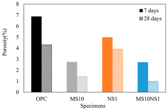 Images of the microstructure were captured using nano-CT equipment to evaluate the porosities of the specimens (Figure 8). Figure 9 shows the porosities of the silicate-based binder composites at the ages of 7 and 28 days. The microstructure analysis results established that the porosity of the specimens declined with time, i.e., porosity on day 28 is lower than that on day 7. OPC exhibited the highest total porosity, followed by the nano-silica mix, micro-silica mix, and the mix containing both nano-silica and micro-silica. The nano-silica mix showed the lowest porosity reduction rate between the ages of 7 and 28 days. Its porosity at 7 days was approximately 72.5% of that of OPC, but it was similar to that of OPC at 28 days (approximately 90.9%). In the case of micro-silica, however, the porosity sharply decreased, as it was approximately 39.9 and 33.1% of those of OPC at 7 and 28 days, respectively. The porosity further decreased in the specimen where both nano-silica and micro-silica were added.