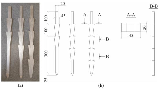 Models of piles with shaft widenings were constructed using wooden beams. The model scale of the piles was set at 1:10. Typically, a pile model with multiple shaft widenings comprises a prismatic section and widening portions resembling inverted flat truncated pyramids. In the experiments, pile models with 2, 3, and 4 shaft widenings were employed (see Figure 1). The height of each model widening measured 100 mm, and the top dimensions of the widening were 20 × 45 mm. The prismatic portion of the pile possessed a square cross-section with dimensions of 20 × 20 mm. The overall shaft length of the pile model extended to 500 mm. Detailed geometric specifications and the mass of the pile models are presented in Table 1 for reference.